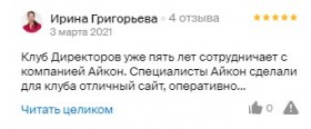 "Клуб Директоров уже пять лет сотрудничает с компанией Айкон. Специалисты Айкон сделали для клуба отличный сайт, оперативно обновляют информацию на нем, всегда квалифицированно отвечают на наши запросы .