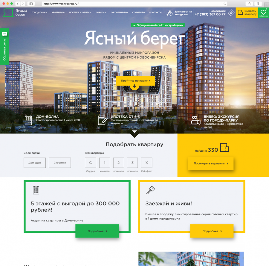 Сайт выглядит органично, красиво и современно, в точности повторяя сам город-парк. В итоге можно сказать, что http://www.yasnybereg.ru/ - первый шаг к покупке квартиры для потенциальных клиентов. А это ли не главное?